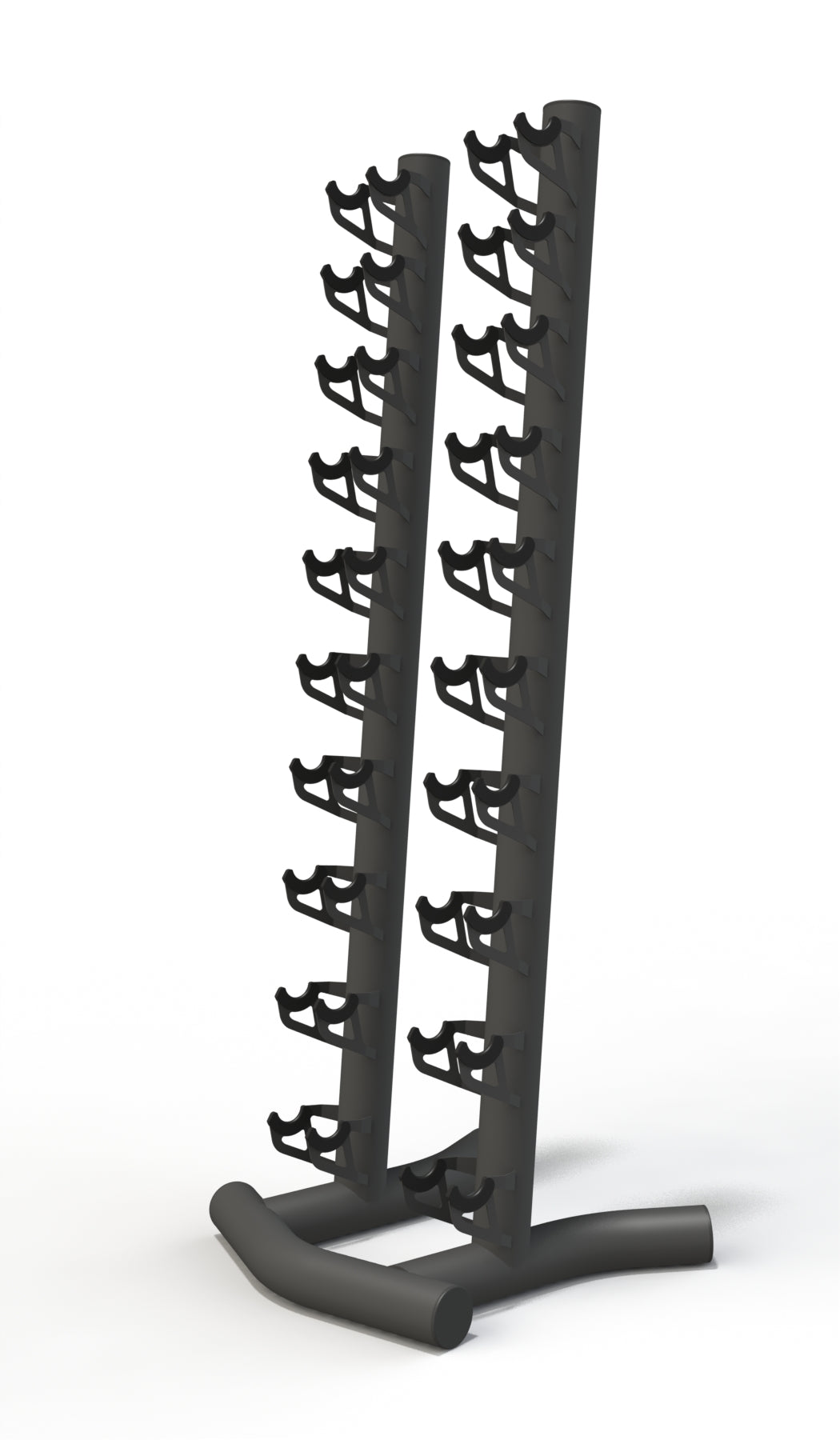 Стойка для гантелей на 10 комплектов PTP 566 представляет собой металлическую конструкцию, состоящую из двух стоек закрепленных на основании. На стойках закреплены держатели гантелей/
